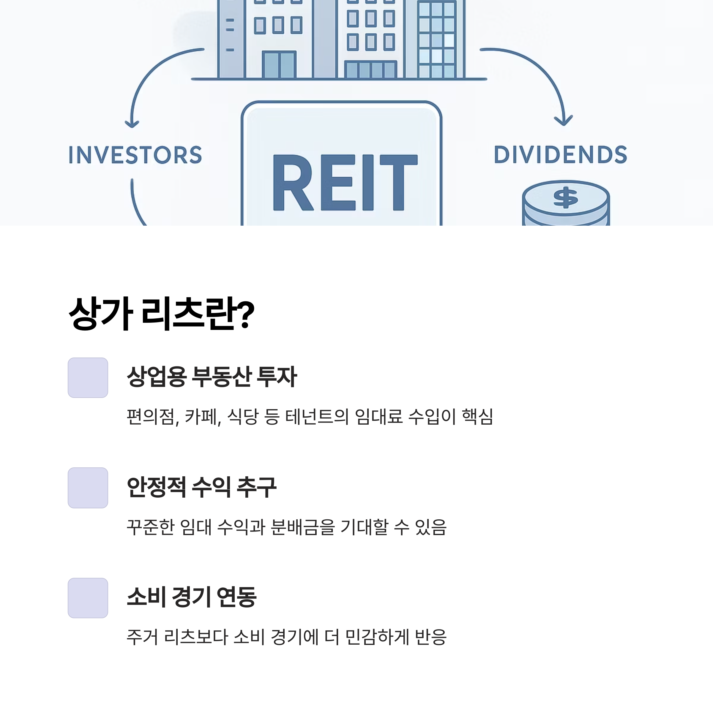 상가 리츠(Real Estate Investment Trust)는 꾸준한 임대 수익과 분배금을 기대할 수 있어