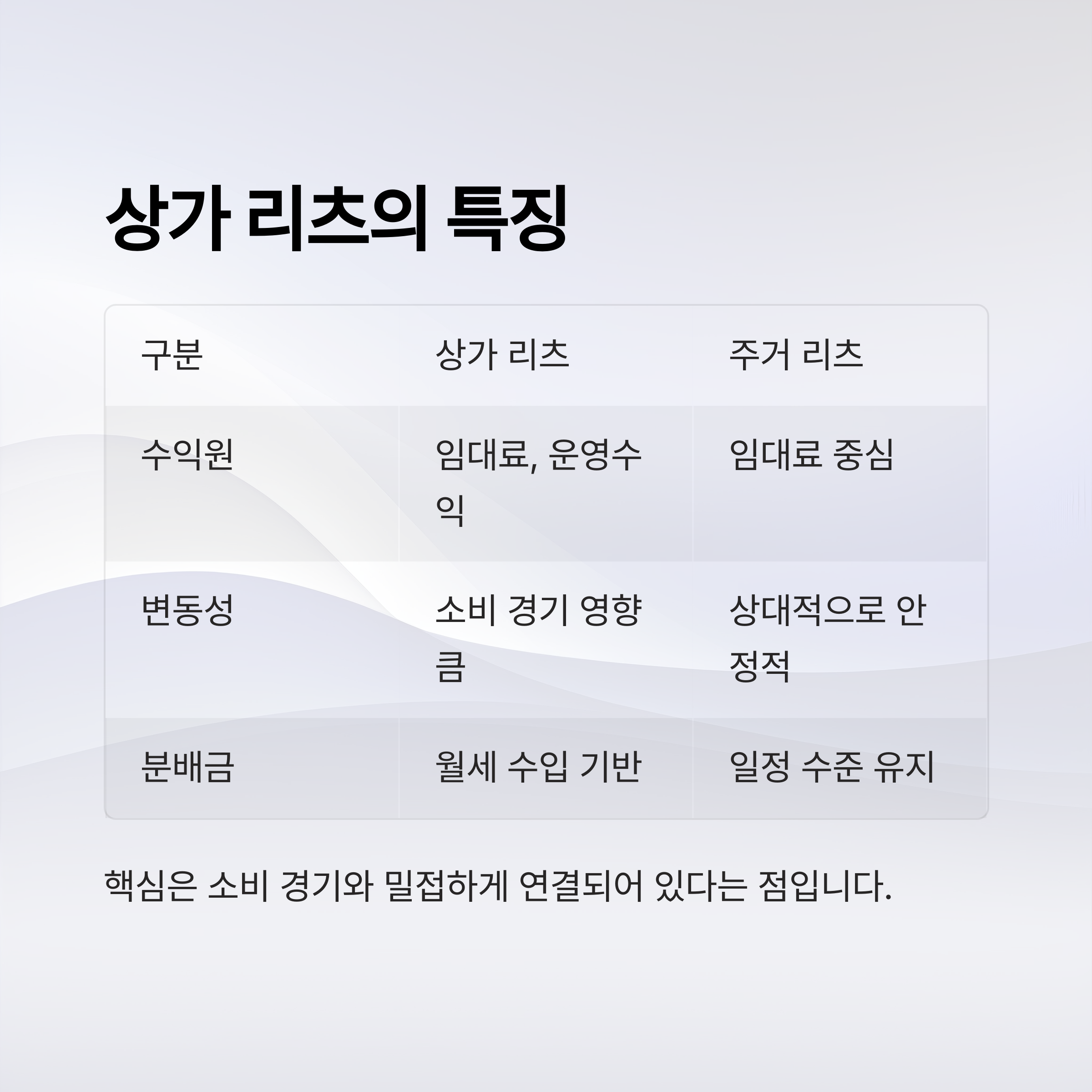 상가 리츠의 핵심 특징은 아래 표로 정리할 수 있습니다.