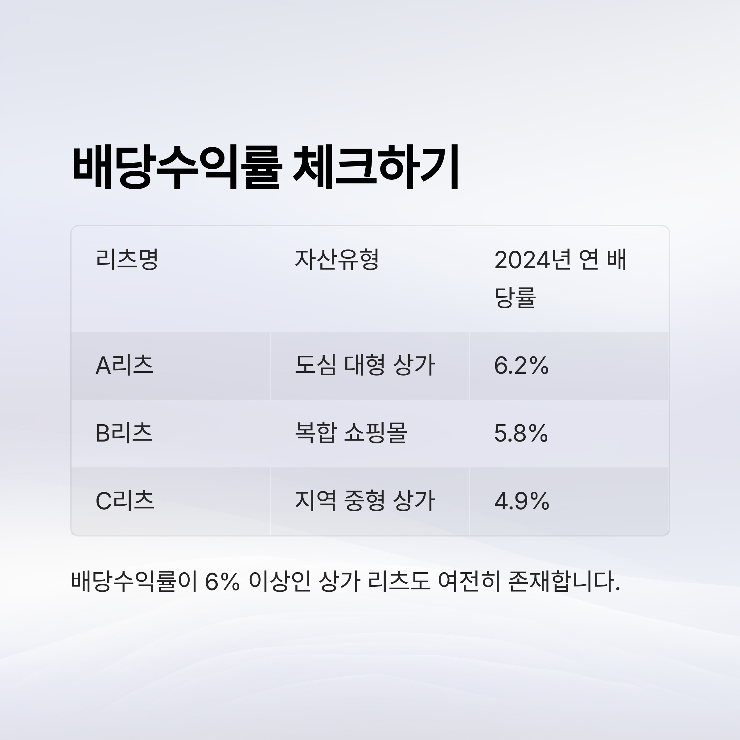 다음 표는 주요 상가 리츠의 최근 배당수익률 예시입니다.
