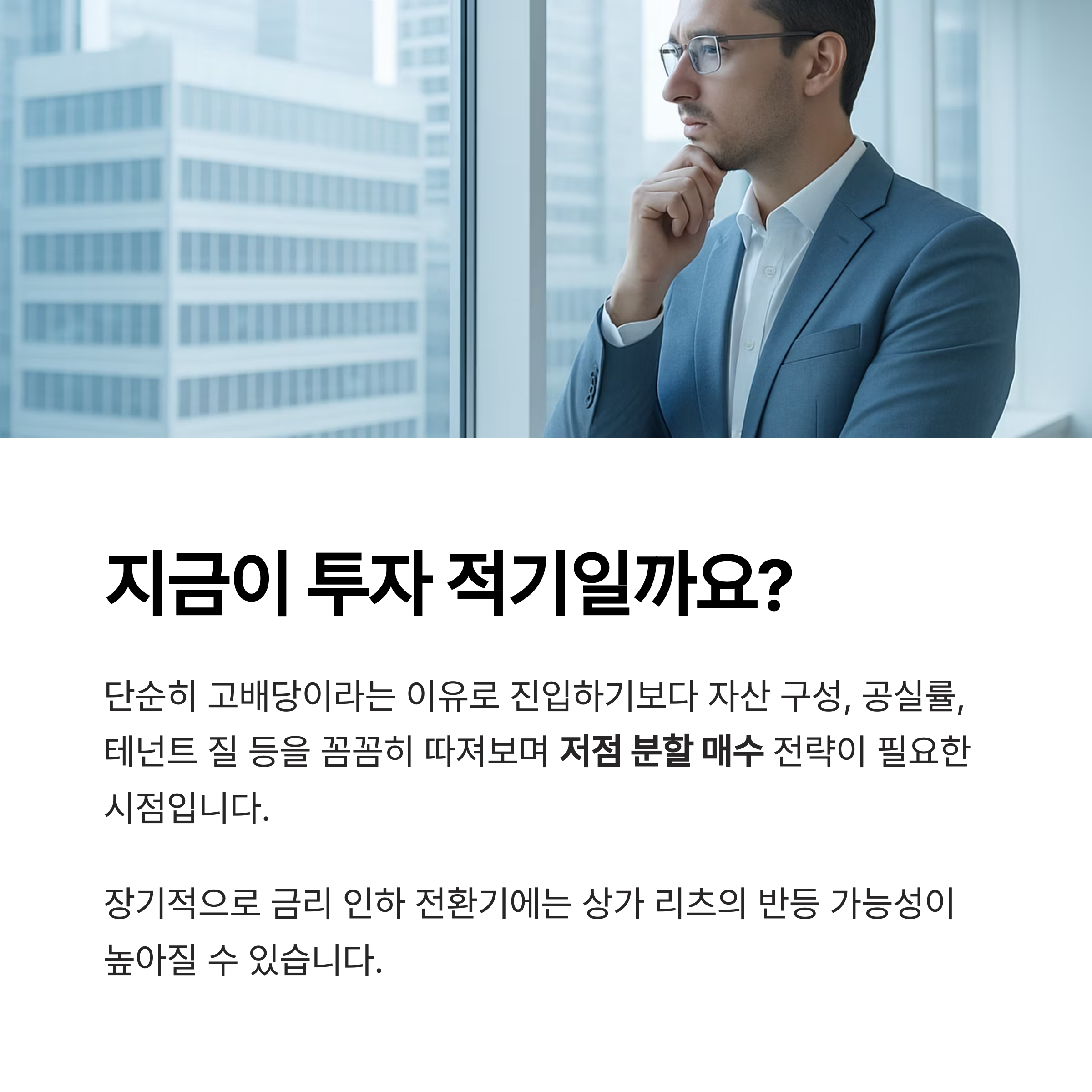 지금이 과연 상가 리츠 투자에 적절한 시점인지 판단할 수 있도록 돕겠습니다.