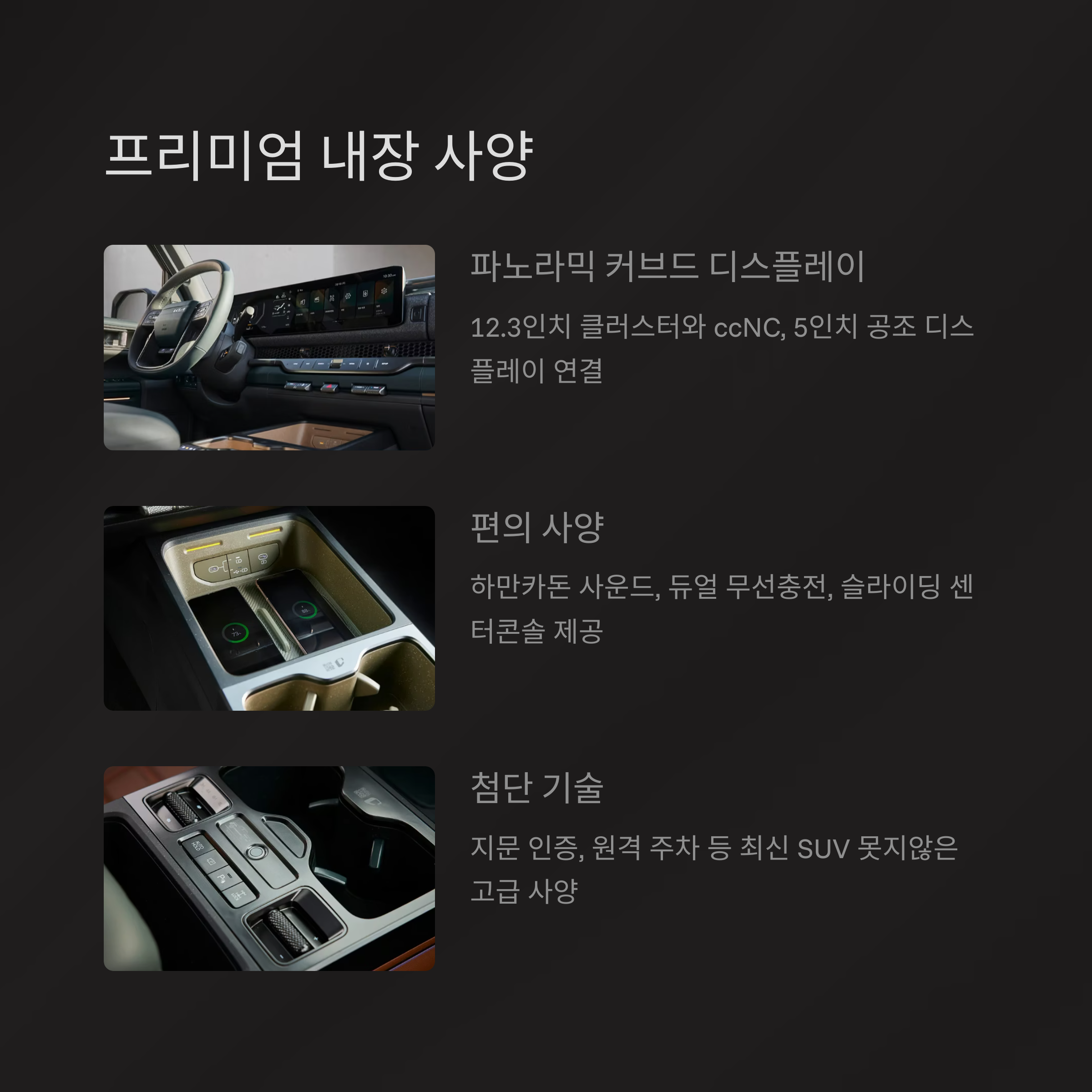 하만카돈 사운드 시스템, 듀얼 무선충전, 슬라이딩 센터콘솔, 지문 인증, 원격 주차 등