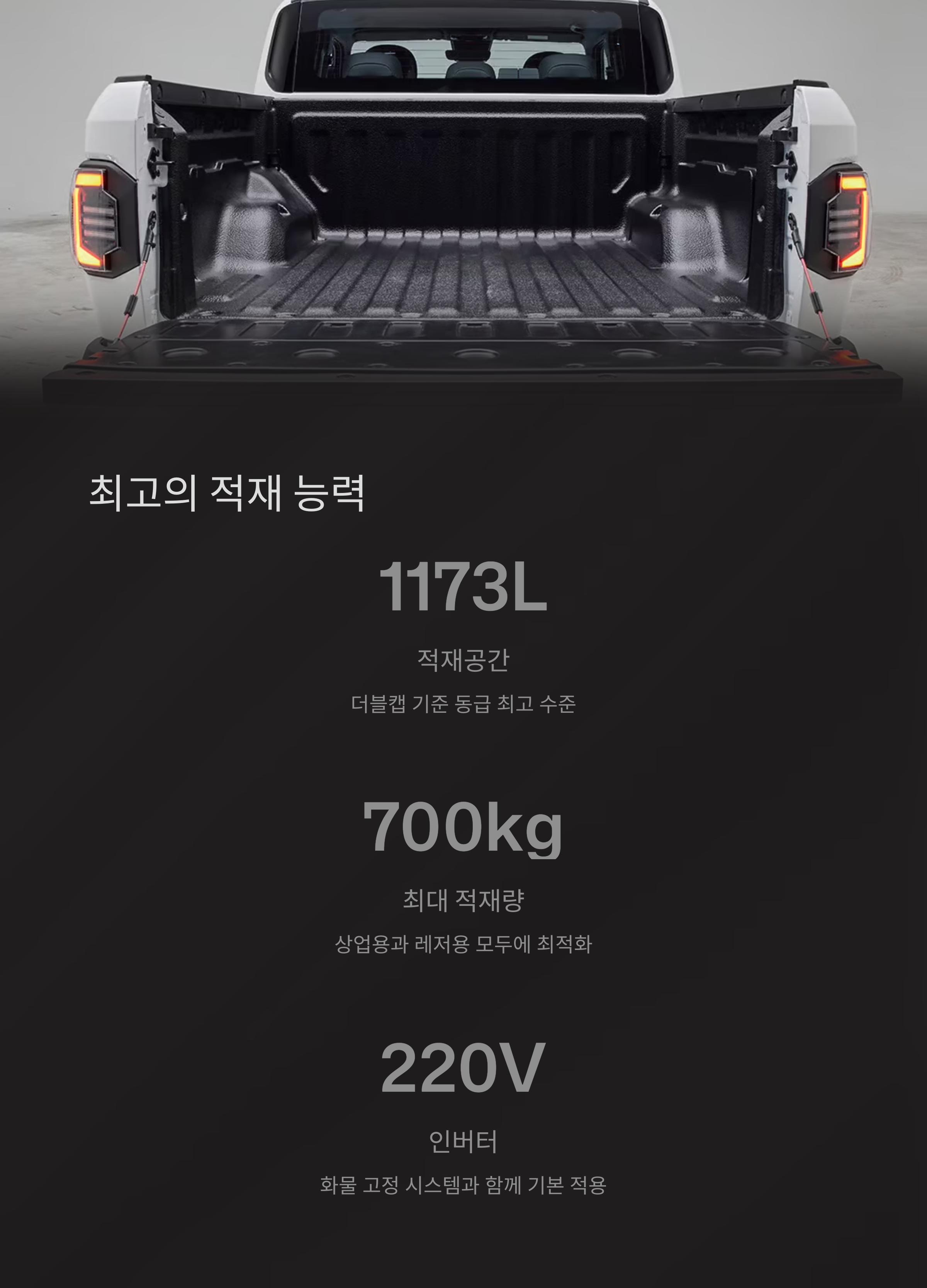 더블캡 기준, 1173L 적재공간과 700kg 최대 적재량은 동급 최고 수준입니다.