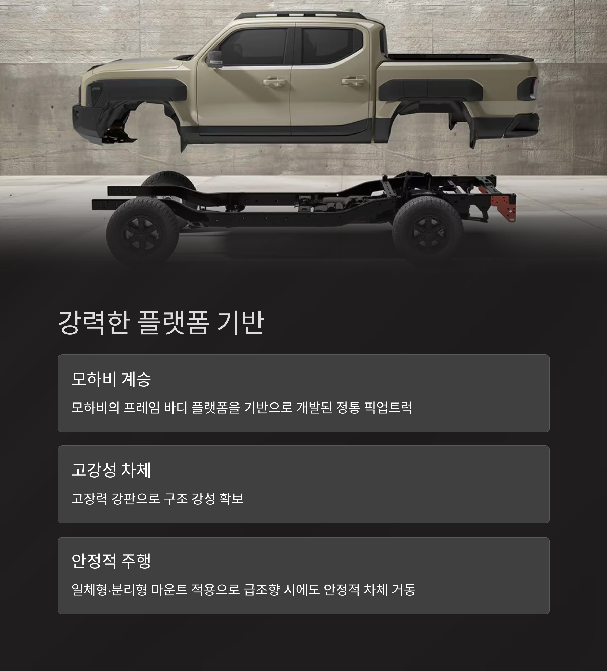 기아 타스만은 모하비의 프레임 바디 플랫폼을 계승하여 개발된 정통 픽업트럭입니다.