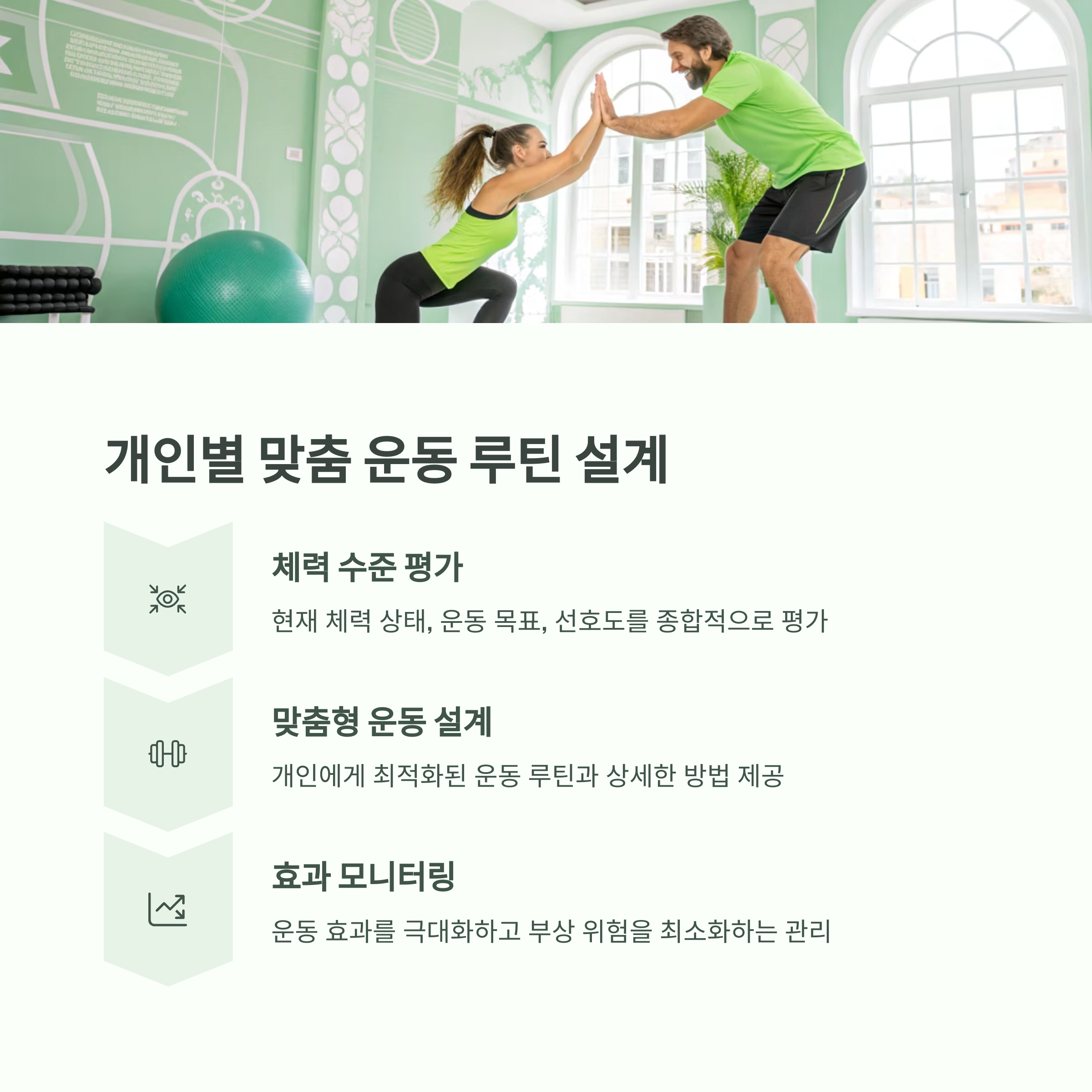 개인의 체력, 운동 목표, 부상 이력 등을 반영해 최적의 운동 루틴을 제공합니다.
