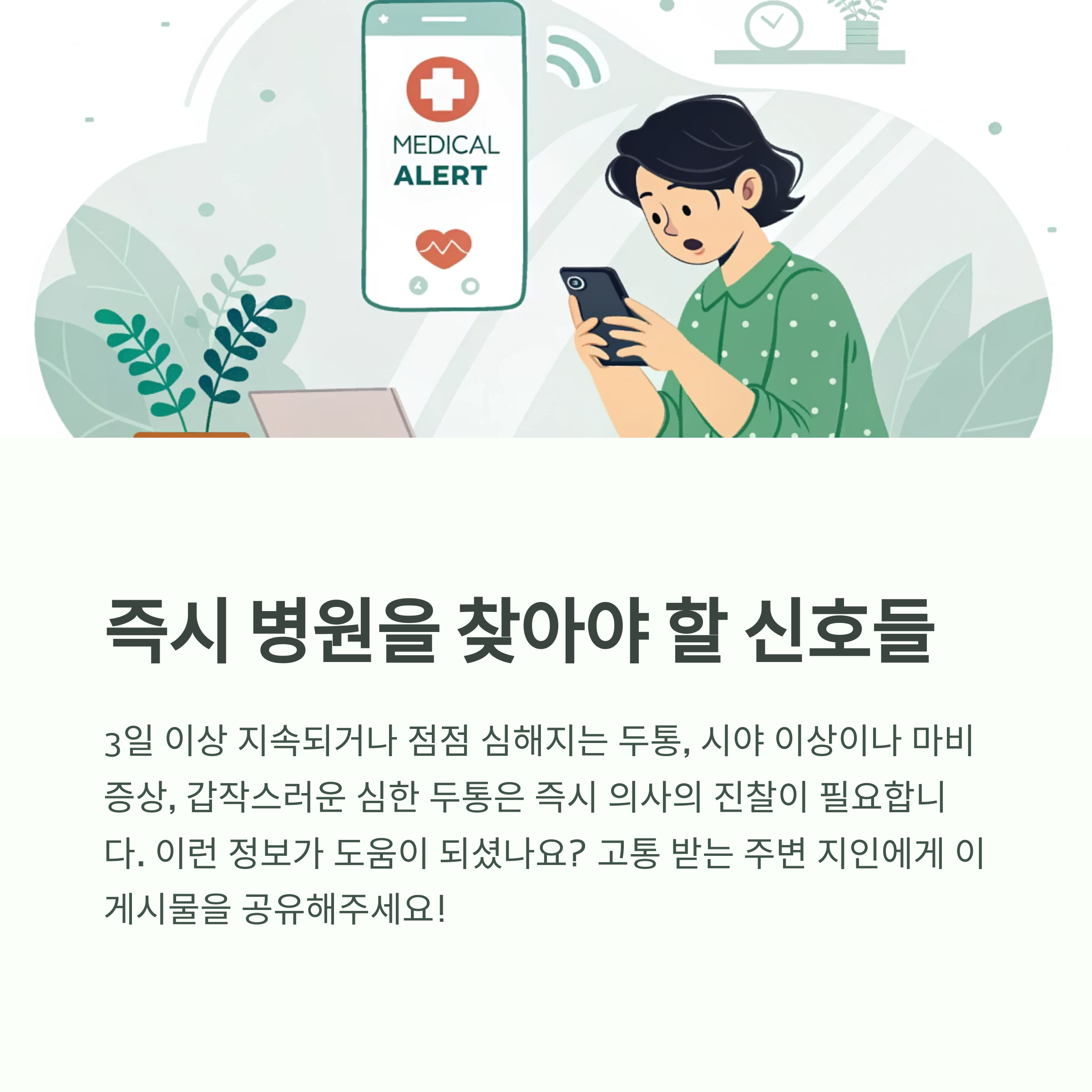 "두통이 갑자기 심해지거나, 신경학적 증상이 동반된다면 즉시 병원을 방문해야 합니다."