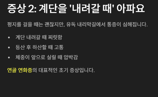 이 증상은 특히 **연골 연화증(무릎 앞 연골 약화)**에서 흔히 나타납니다.