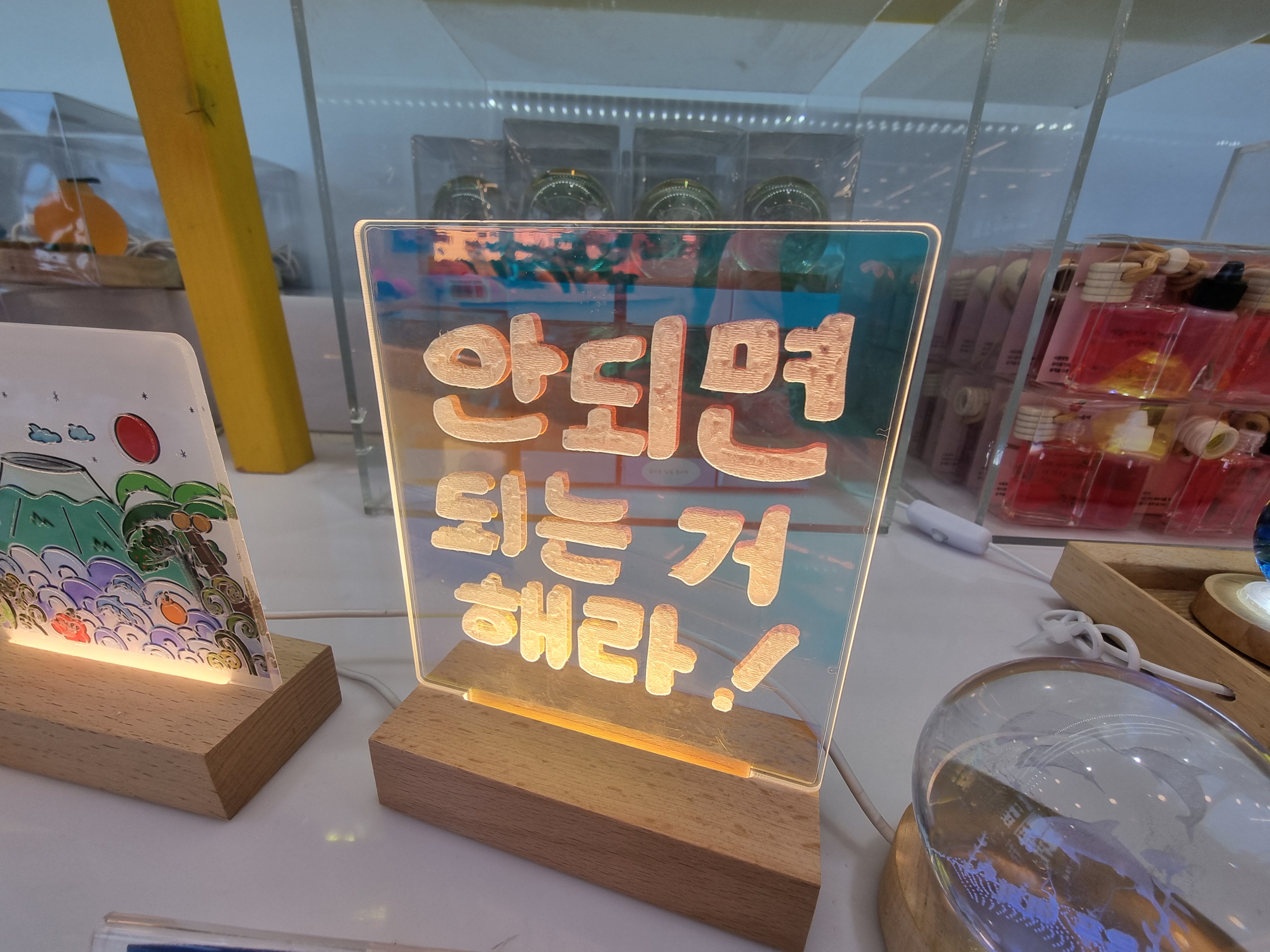 센스 넘치고 위트 있으면서도, 묘하게 위로가 되는 말이었어요. 저 문구가 적힌 손거울, 엽서, 스티커, 심지어 에코백까지 다양한 굿즈들이 있었는데, 모두 제주 특유의 자유로운 감성과 맞닿아 있더라고요.