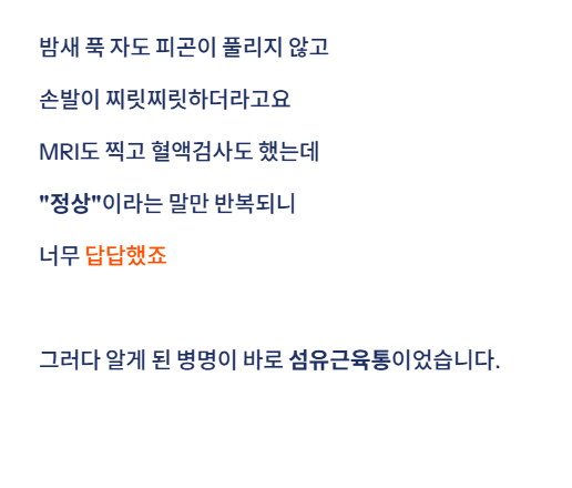 안녕하세요! 저도 예전에는 여기저기 쑤시고 피곤한 게 단순 스트레스 때문이라고 생각했어요. 근데 어느 날, 밤새 푹 자도 피곤이 풀리지 않고 손발이 찌릿찌릿하더라고요. 병원에 가서 MRI도 찍고 혈액검사도 했는데 "정상"이라는 말만 반복되니 너무 답답했죠. 그러다 알게 된 병명이 바로 섬유근육통이었습니다. 그날 이후 제 인생이 조금씩 달라지기 시작했어요. 이 글을 통해 여러분께서도 혹시 모를 섬유근육통에 대해 정확히 알고, 그동안 느껴온 '이유 없는 통증'에 대한 해답을 찾으실 수 있길 바랍니다.