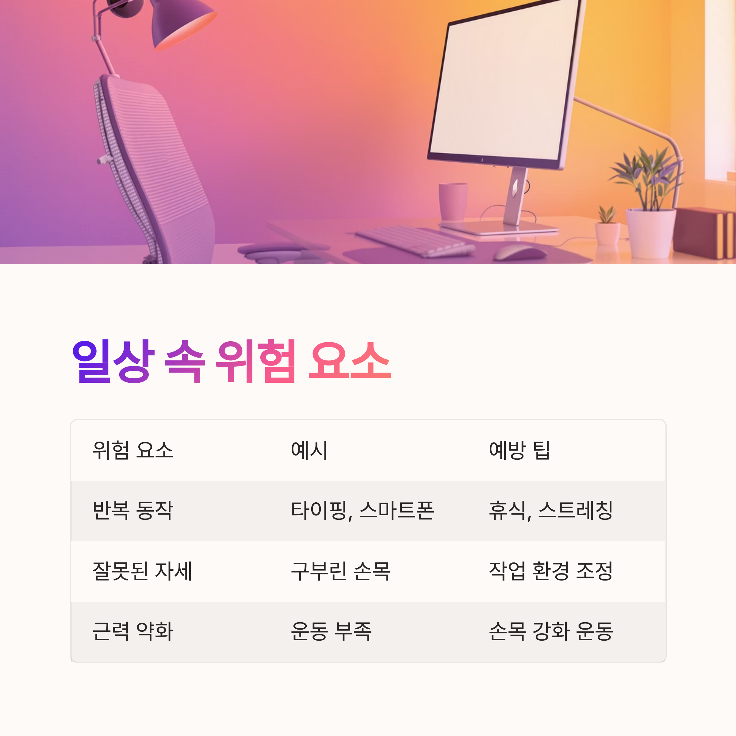 손목을 반복적으로 사용하는 습관은 대표적인 위험 요소입니다.