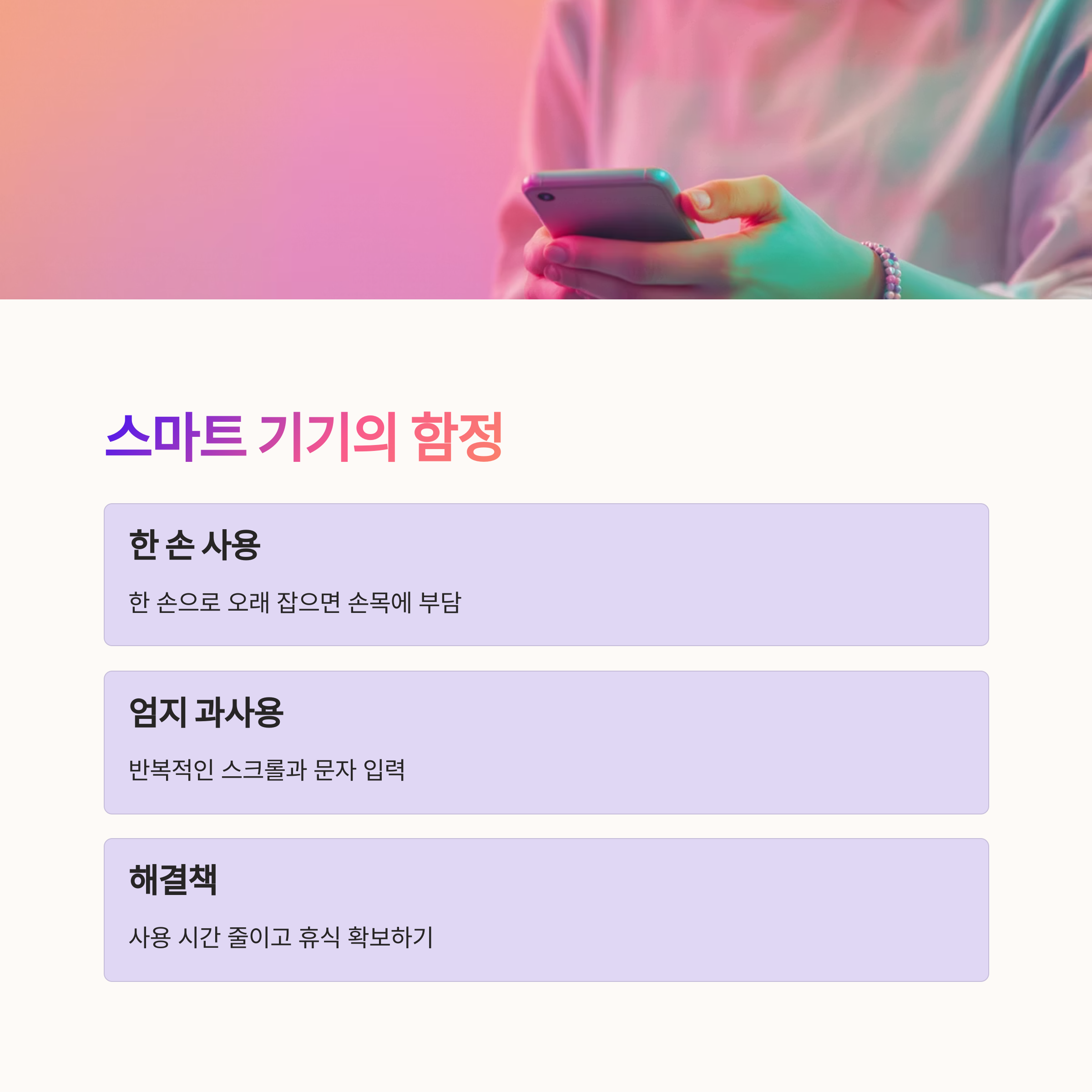 스마트폰은 양손으로 사용하기, 손목 받침대 사용하기 등
