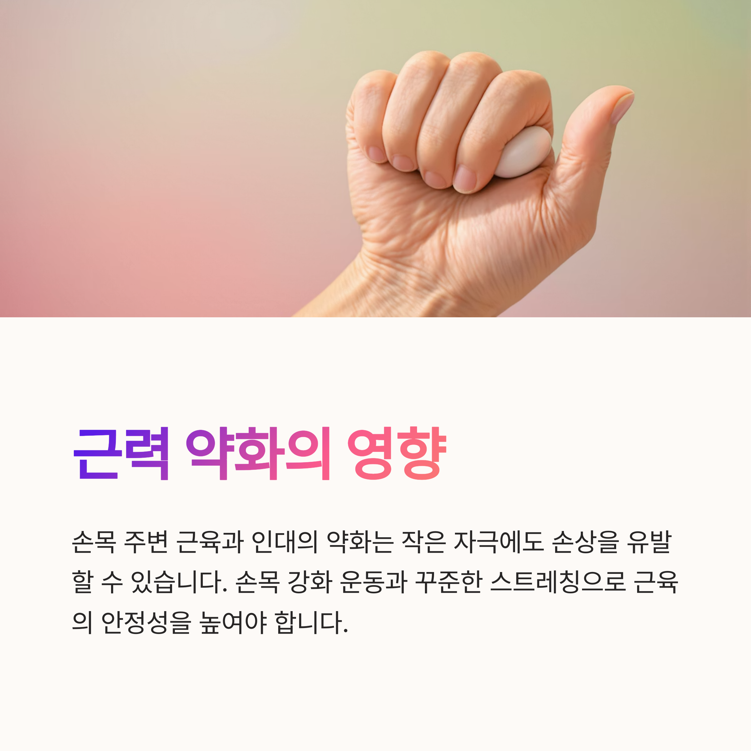 손목 주변 근육과 인대의 약화는 작은 자극에도 손상을 유발할 수 있습니다.