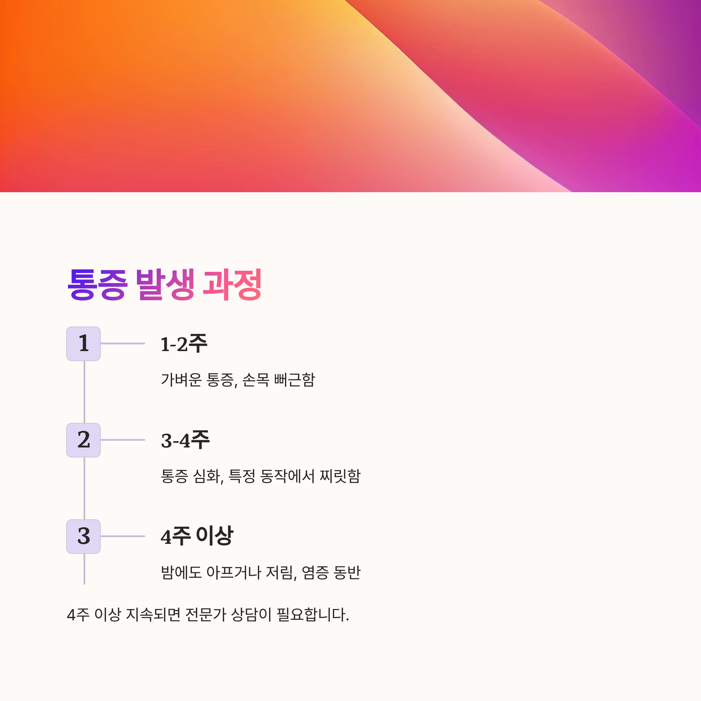 4주 이상: 밤에도 아프거나 저림, 염증 동반