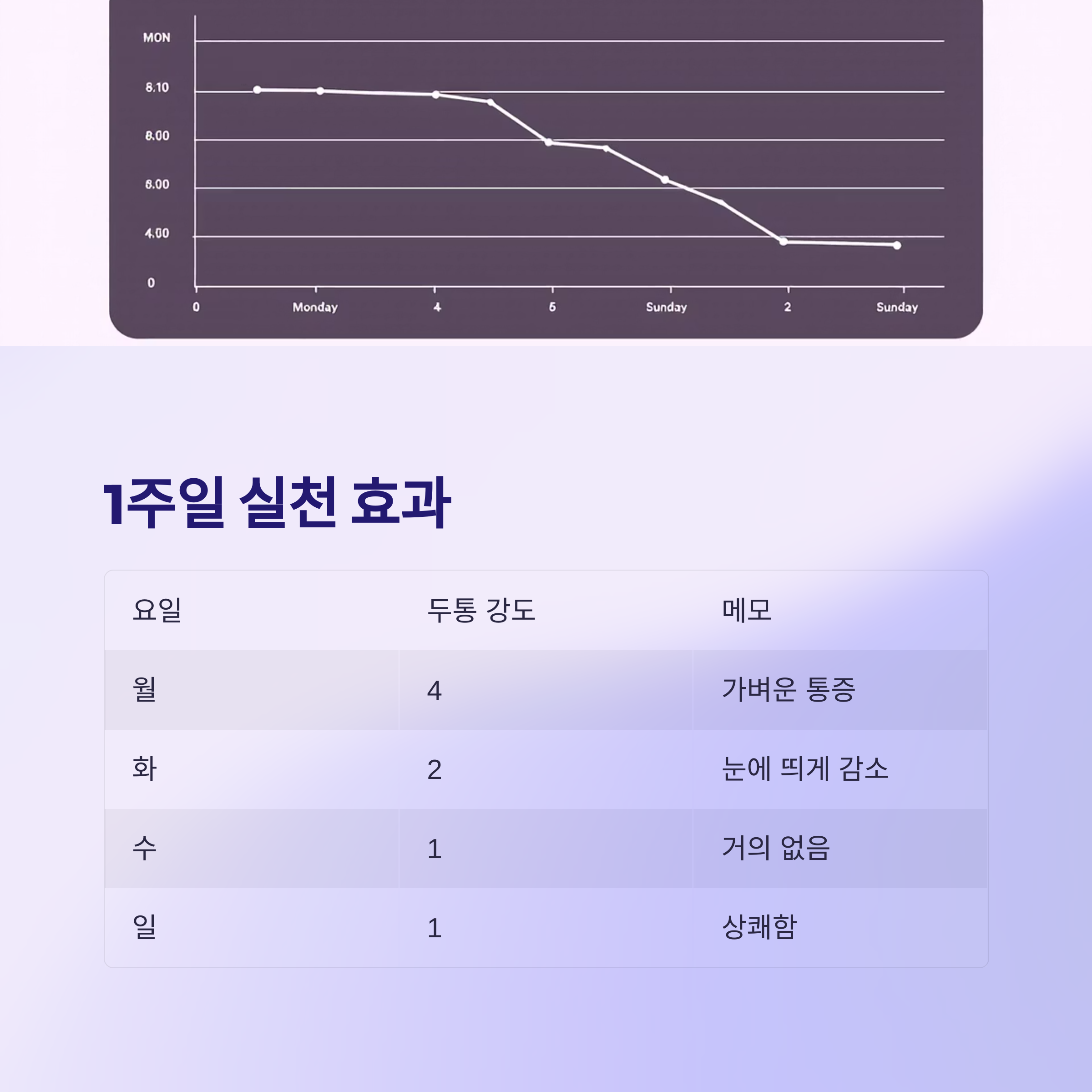 | 월 | O | 4 | 가벼운 통증 지속 |