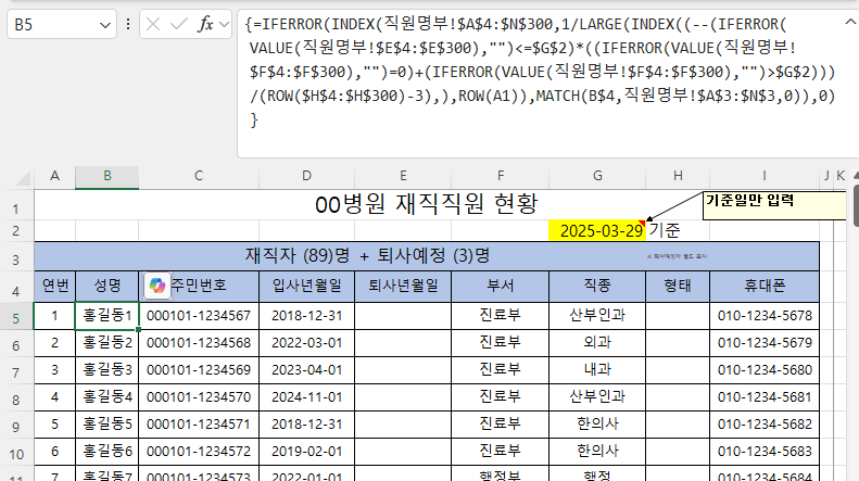 - 재직자 수식: 입사일 ≤ 기준일 (퇴사일이 비어있거나 기준일보다 이후)