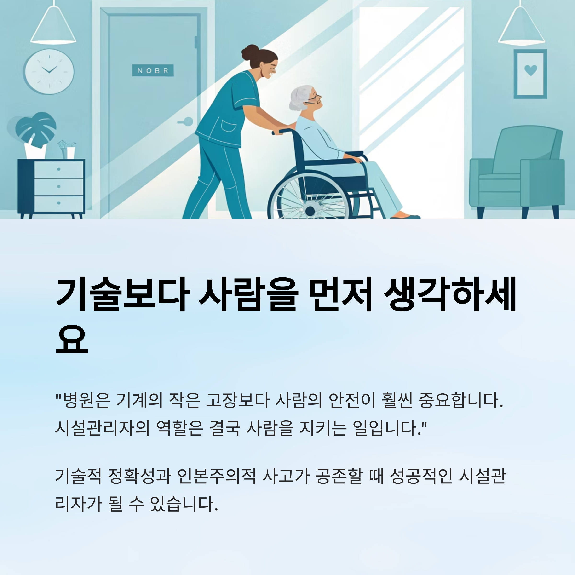 요양병원에서 7년째 근무 중인 시설관리자 A씨의 조언처럼, 기술적 정확성과 인본주의적 사고가 공존해야 성공적인 요양병원 시설관리자가 될 수 있습니다.