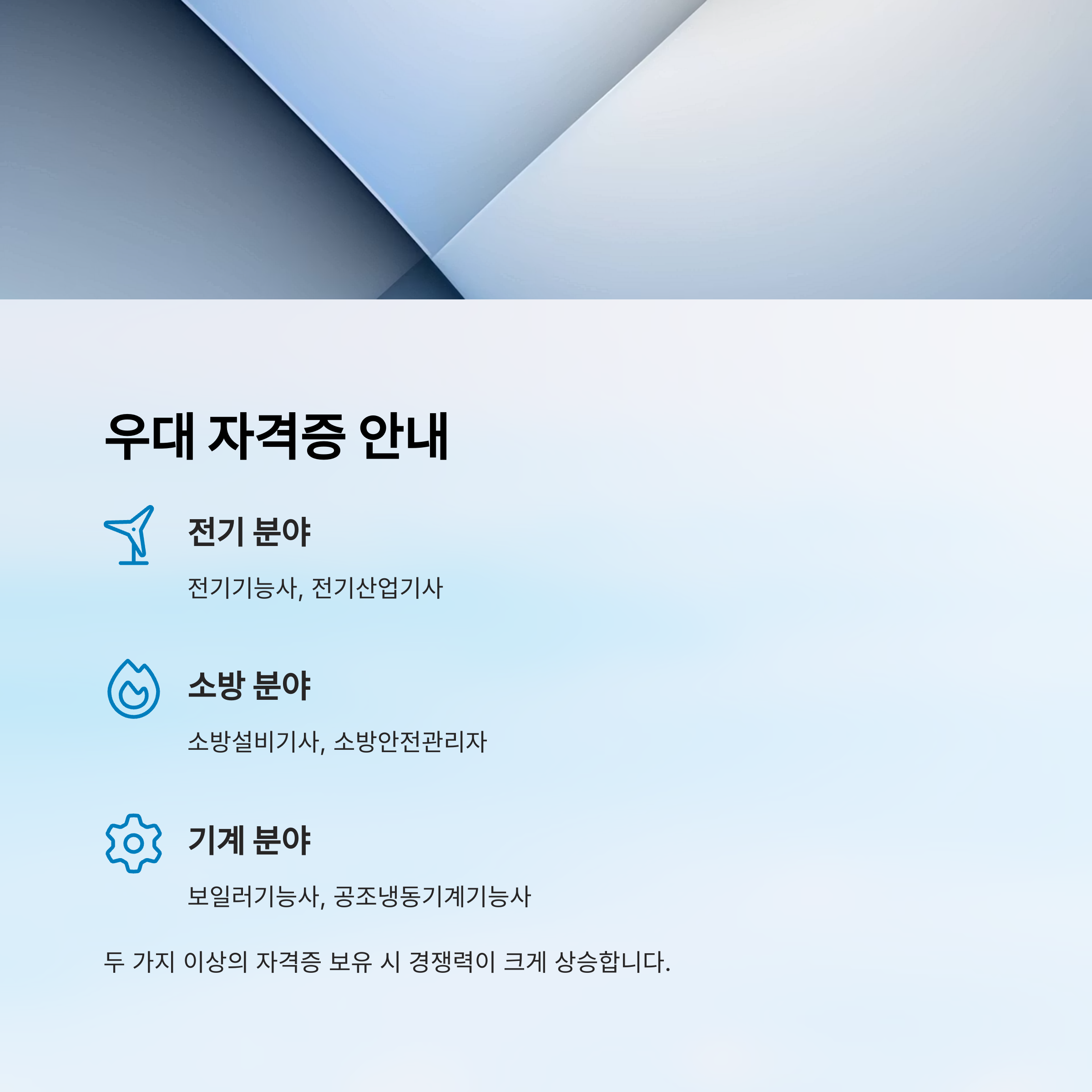 - 소방·기계·전기 관련 자격증 소지