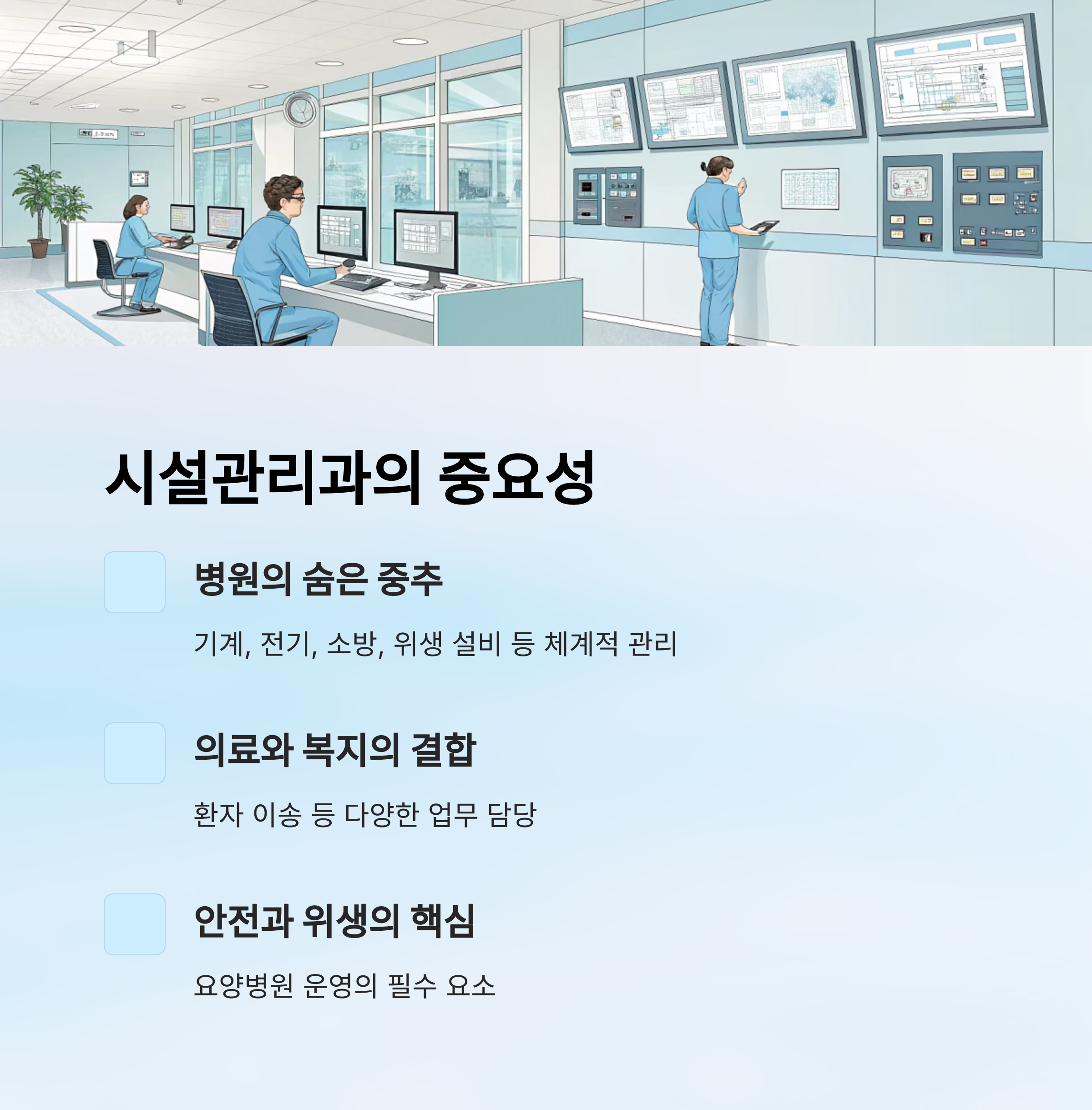 요양병원은 의료와 복지 기능이 결합된 특수한 공간으로, 시설의 안정성과 위생, 장비 유지관리가 매우 중요합니다. 시설관리과는 요양병원의 숨은 중추로서, 기계, 전기, 소방, 위생 설비뿐 아니라, 환자 이송 등 다양한 업무를 체계적으로 관리하는 핵심 부서입니다.