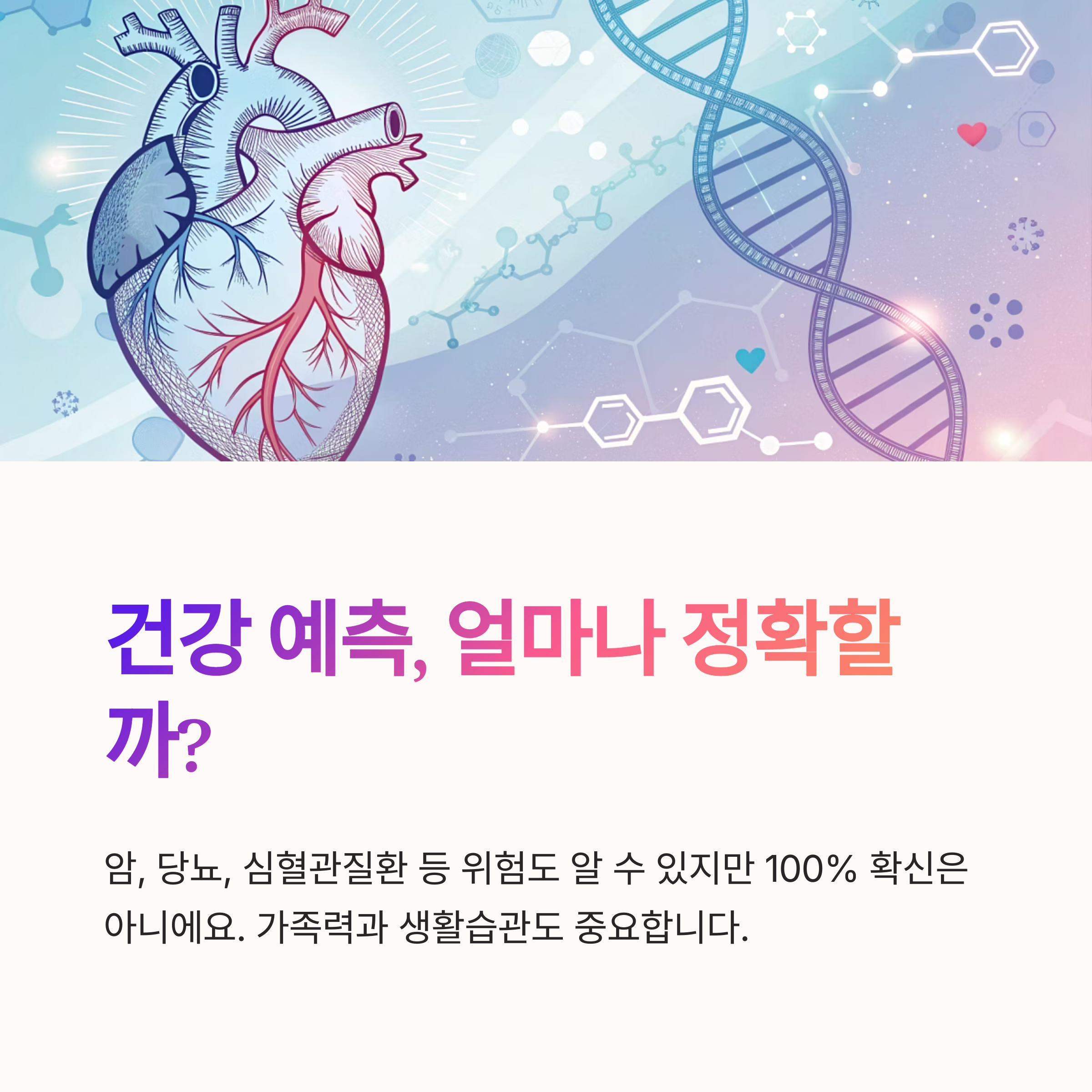 유전자 검사를 통해 심혈관 질환, 당뇨병, 암 등 다양한 질병 위험을 미리 파악할 수 있습니다.