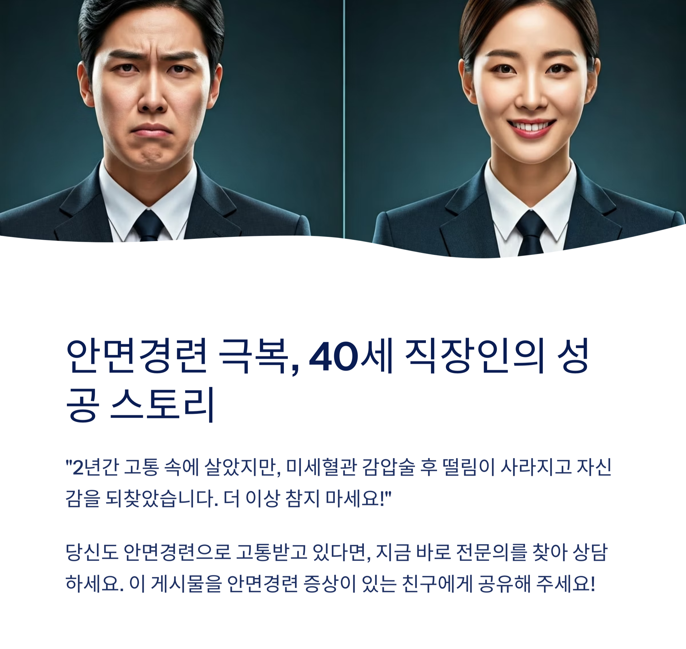 한 40세 직장인은 2년간 왼쪽 눈 밑과 입꼬리 떨림에 시달렸습니다.