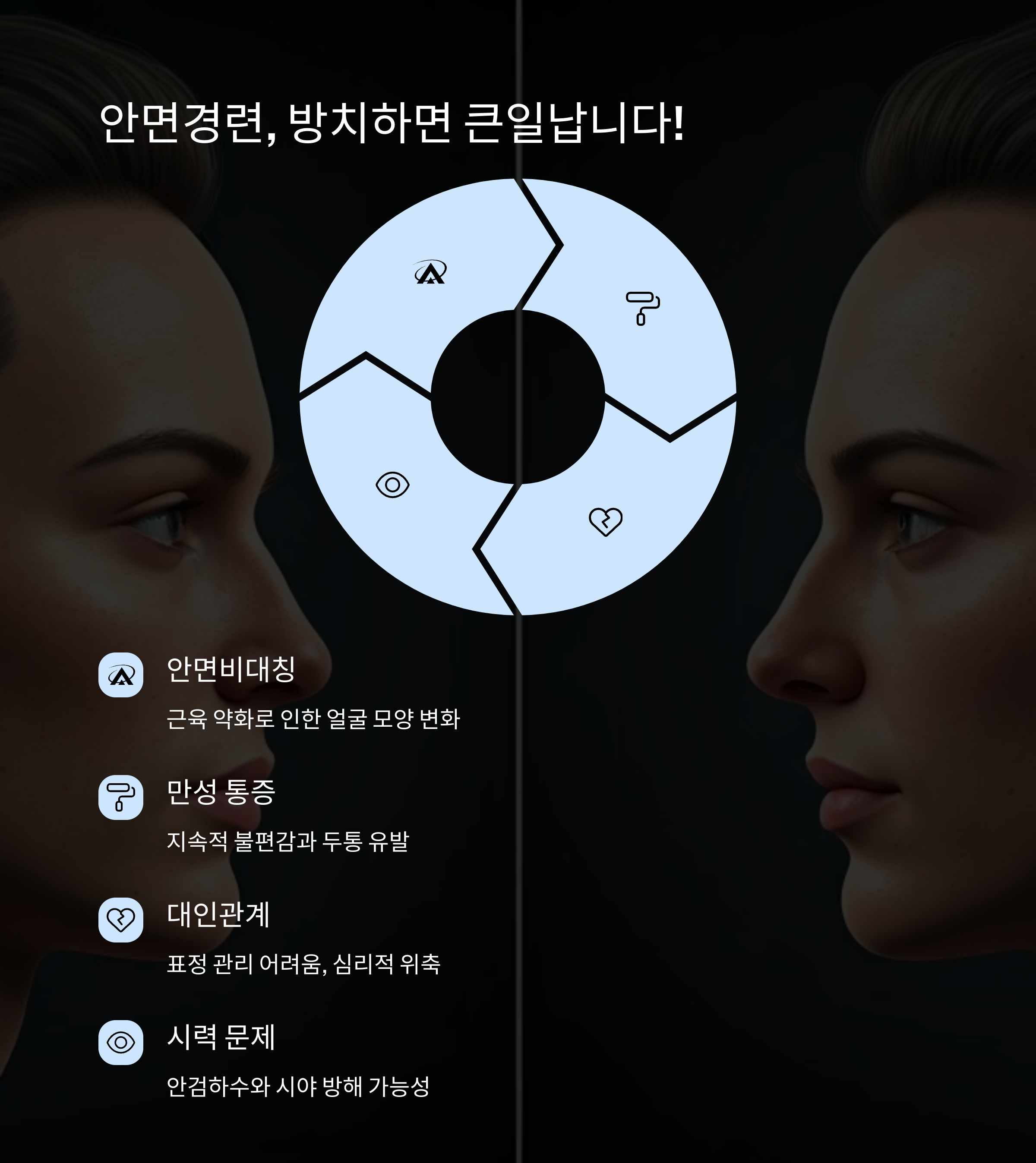 안면경련을 치료하지 않고 방치할 경우, 안면 비대칭이 나타날 수 있습니다.