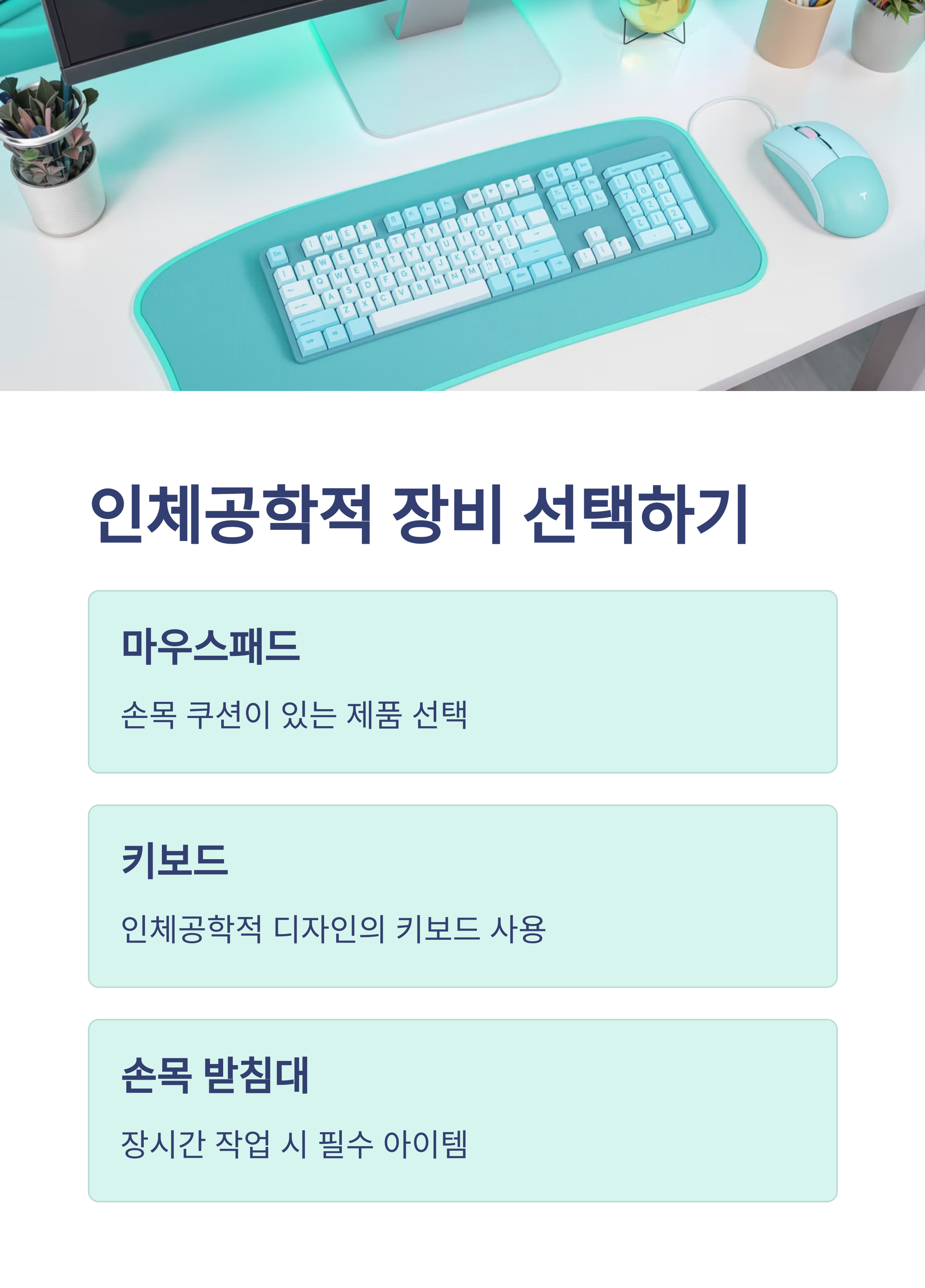 "손목 쿠션이 있는 마우스패드나 인체공학 키보드 사용은 중요합니다."