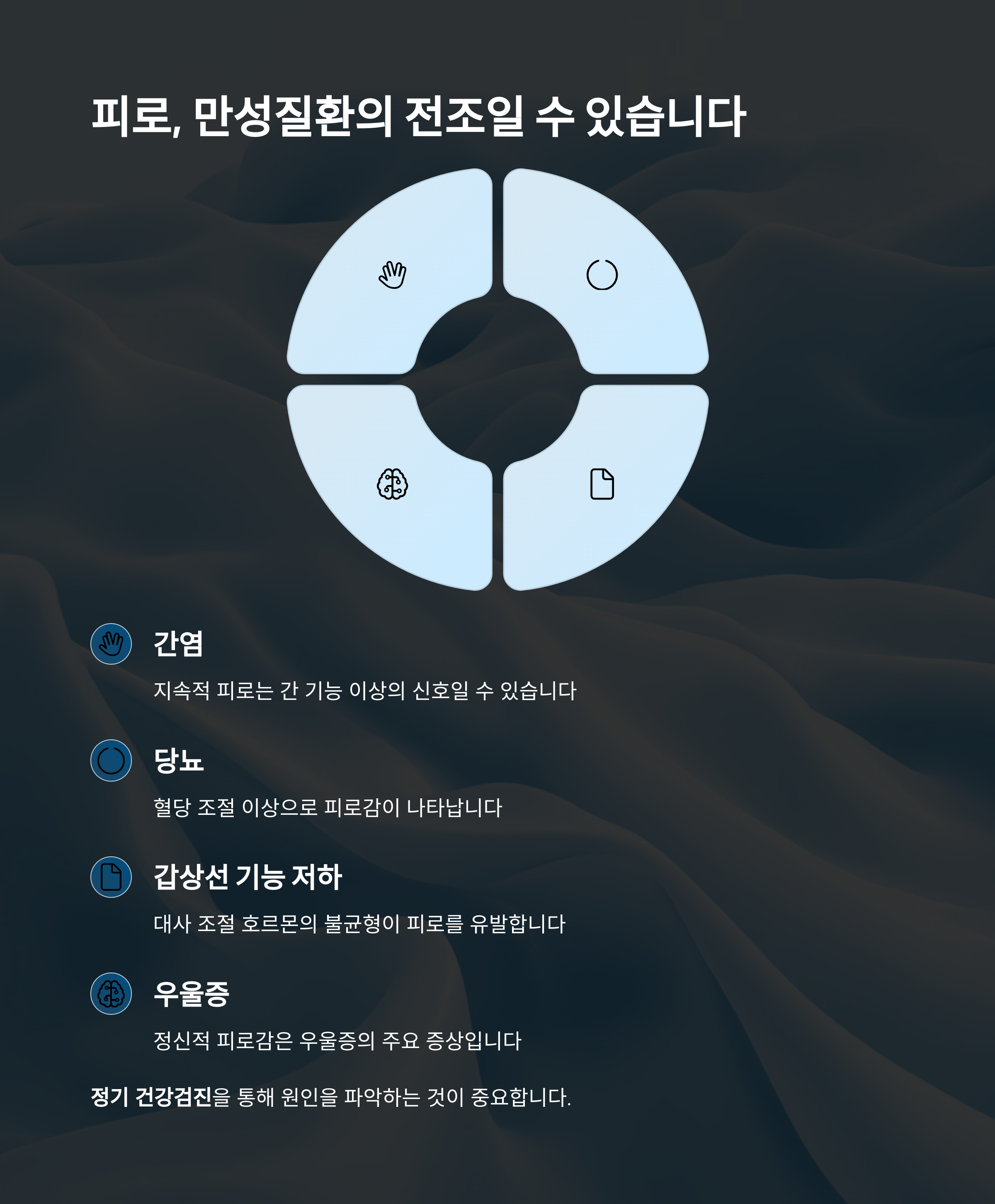 간혹 피로감은 간염, 당뇨, 갑상선 기능 저하, 우울증 같은 질환의 전조 증상이기도 합니다.
