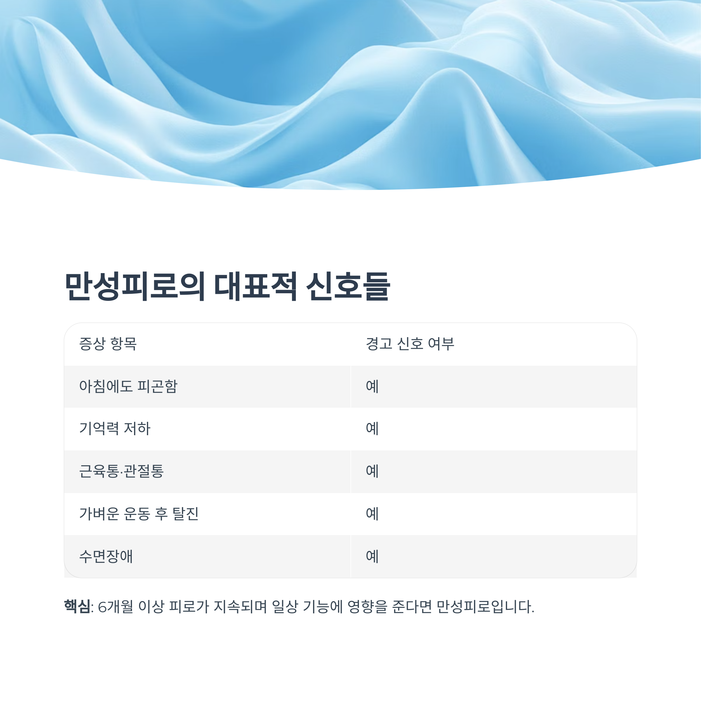 핵심: 6개월 이상 피로가 지속되며 일상 기능에 영향을 준다면 만성피로로 간주합니다.