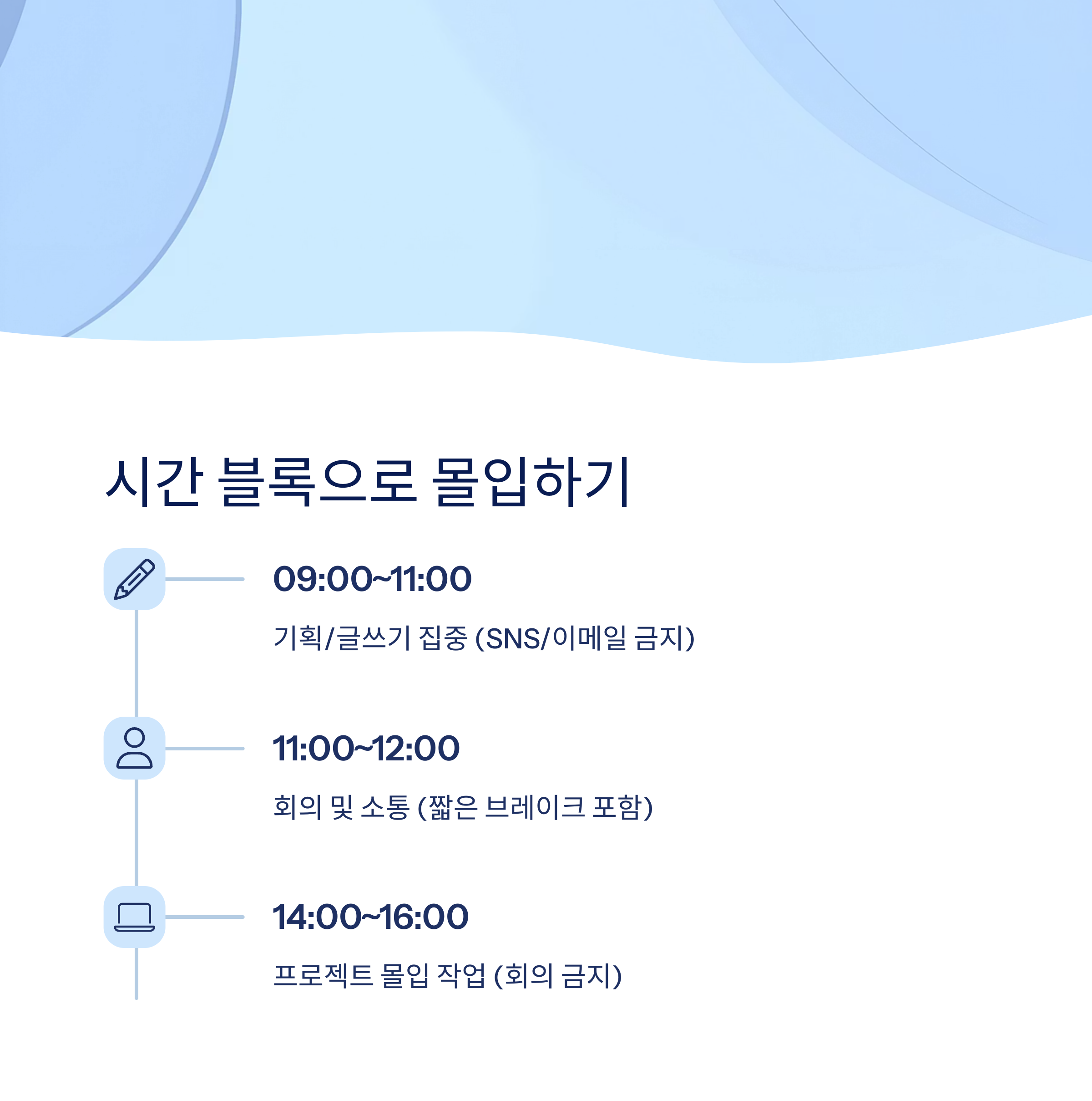 | 09:00~11:00 | 기획/글쓰기 집중 | SNS/이메일 금지 |