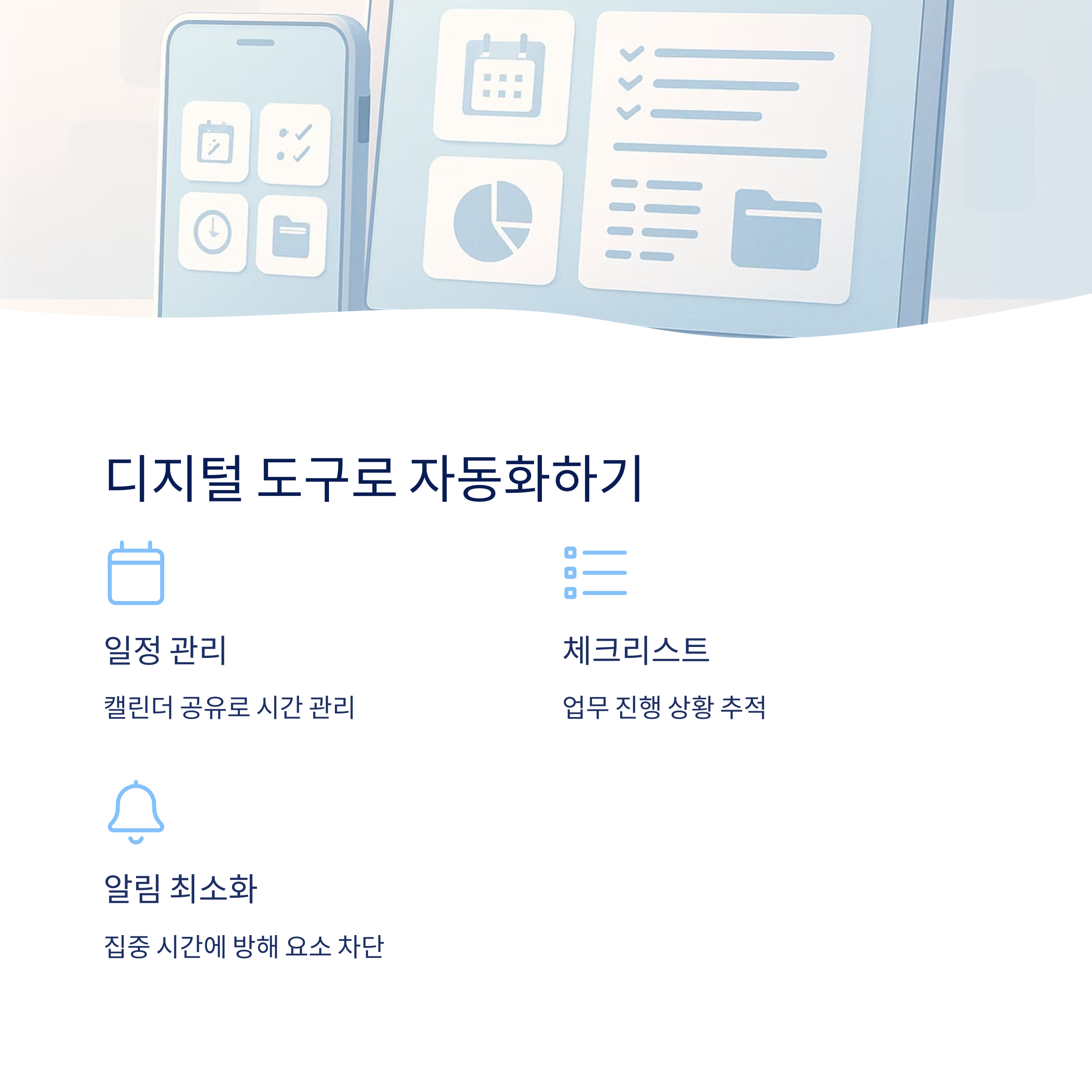 일정, 업무, 알림 등을 자동으로 관리하는 앱과 시스템을 도입하세요.