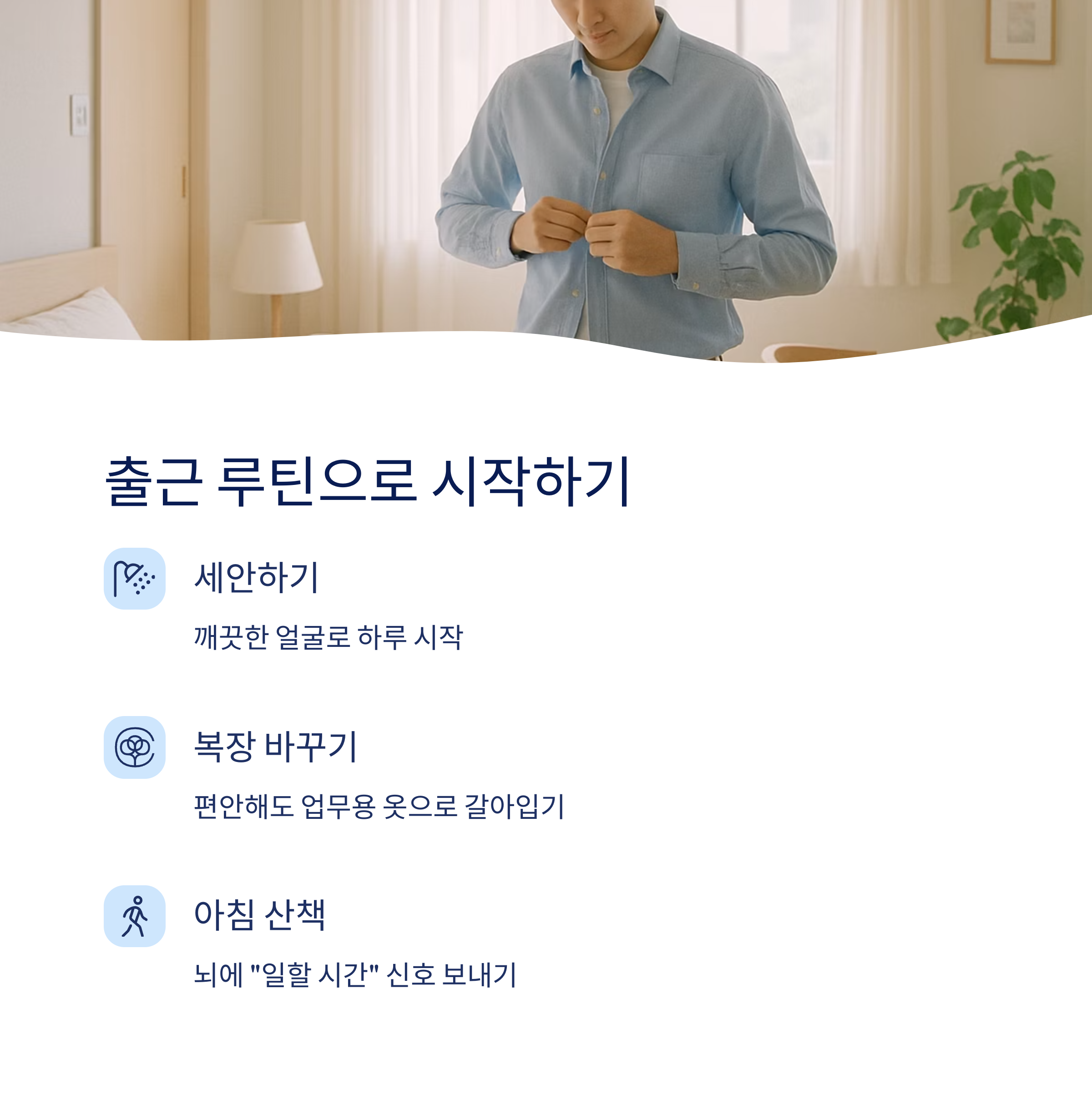 간단한 세안, 복장 변화, 아침 산책, 업무용 책상에 앉기 등