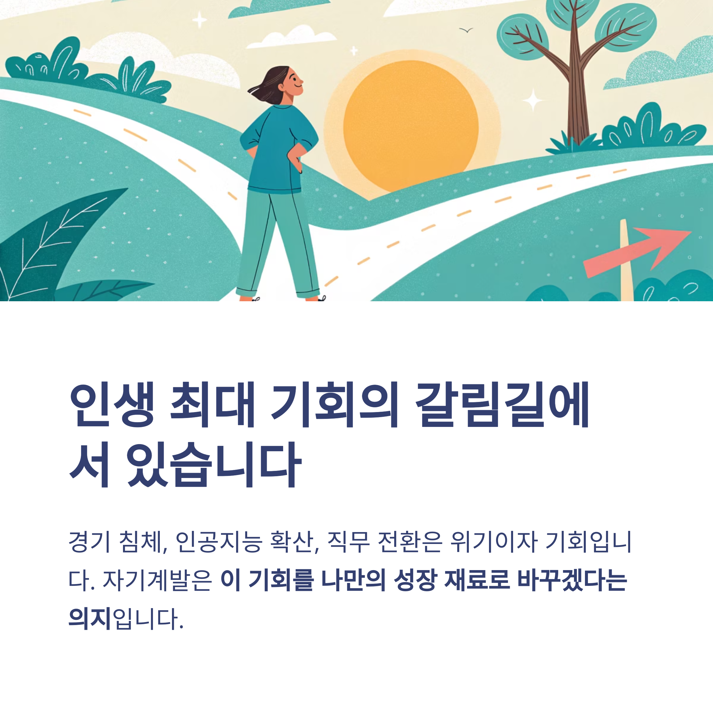자기계발을 시작한다는 것은 이 기회를 나만의 성장 재료로 바꾸겠다는 의지를 뜻합니다.
