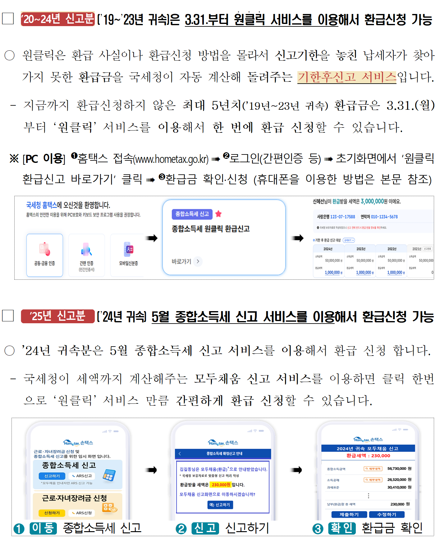 - 안내금액 그대로 신고 시: 환급 1개월 내 지급
