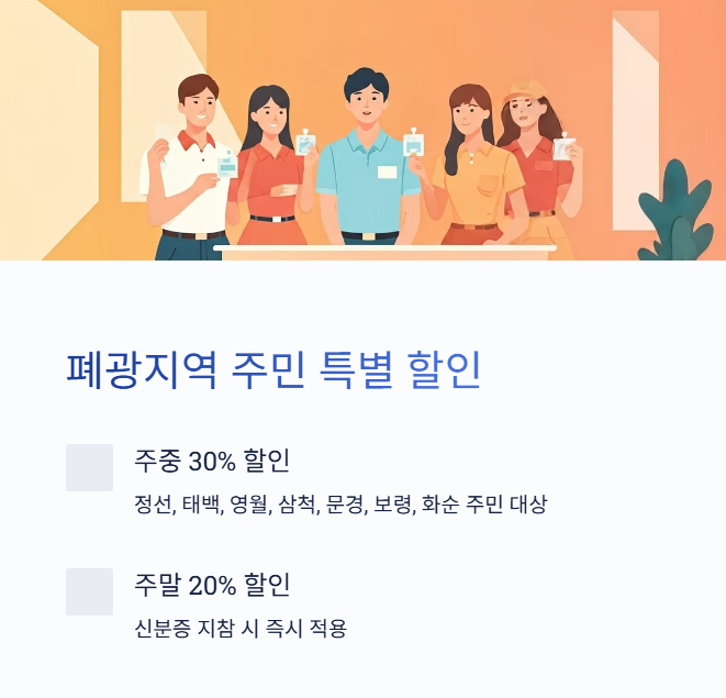 정선, 태백, 영월, 삼척, 문경, 보령, 화순 주민으로 신분증을 지참하면 주중 30%, 주말 20% 할인을 받을 수 있습니다.