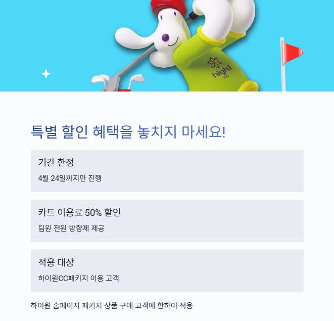- 하이원CC패키지 이용 고객 대상 카트 이용료 50% 할인