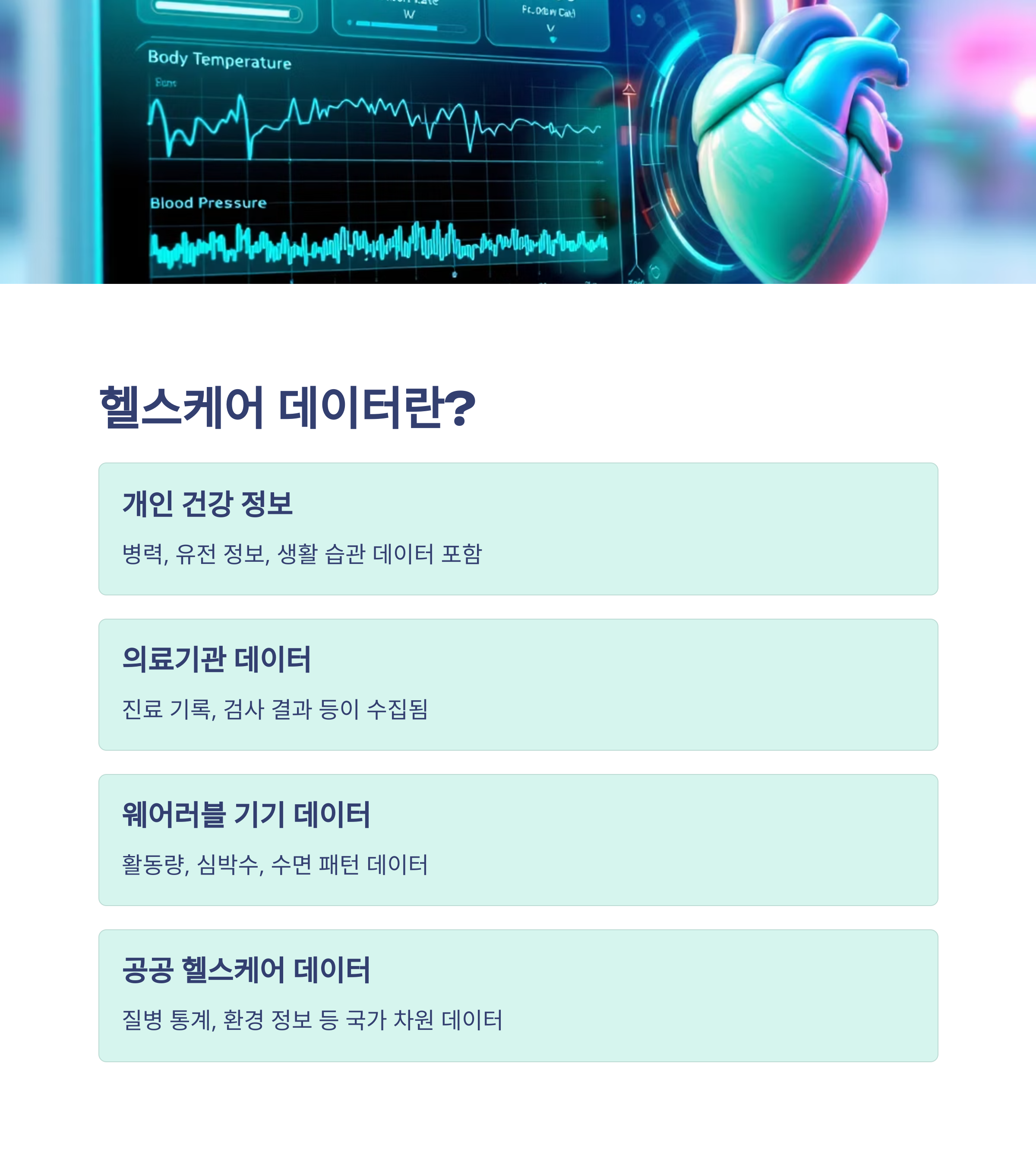 헬스케어 데이터는 심박수, 혈압, 수면 패턴, 운동량, 스트레스 지수 등 다양한 신체 지표를 포함합니다