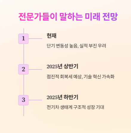 현재 증권가는 2차전지 산업에 대해 단기적인 수요 둔화와 정책 불확실성으로 인한 변동성은 크지만, 중장기적인 구조적 성장은 유효하다고 보고 있어요. 특히 2025년 하반기부터는 전기차 시장의 재성장, 정부 정책 지원 강화, 차세대 소재 기술 상용화 등의 동력이 기대된다고 분석하고 있죠.