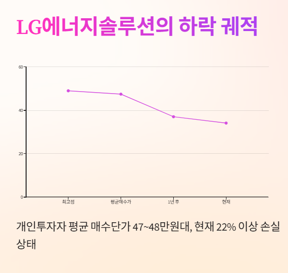 급등락은 없었지만, LG에너지솔루션도 무풍지대는 아니었어요. 48~49만원대의 안정적인 거래가 이어지던 중, 최근 1년 사이 주가가 37만 원대까지 하락하면서 일부 개인투자자들이 결국 손절매에 나섰습니다.