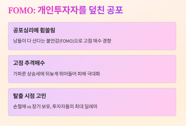 이처럼 포모 현상이 강했던 시기일수록 실질적인 손실이 더 크다는 건, 향후 투자 전략을 수립할 때 반드시 고려해야 할 교훈이 아닐까 싶어요.
