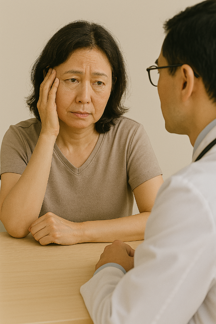 갱년기는 신체적 증상(열감, 발한 등)이 동반되며, 우울증은 지속적인 무기력감과 자존감 저하가 특징이에요. 설문으로 기본 감별은 가능해요.