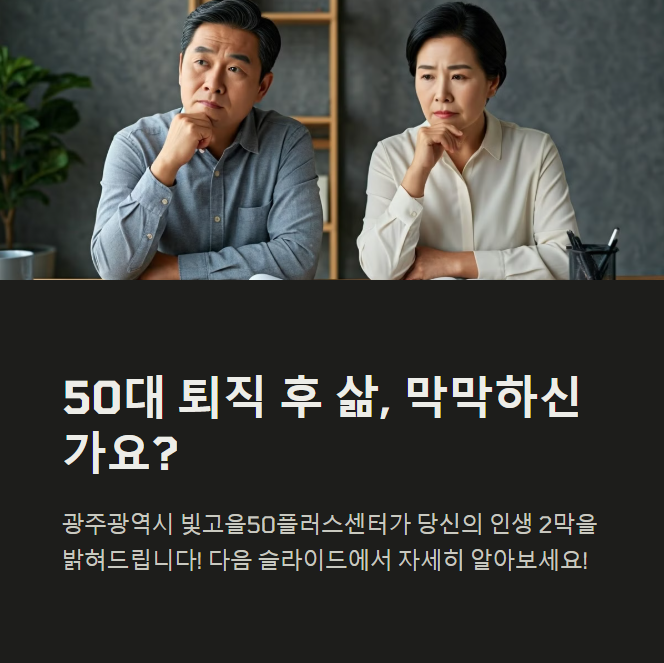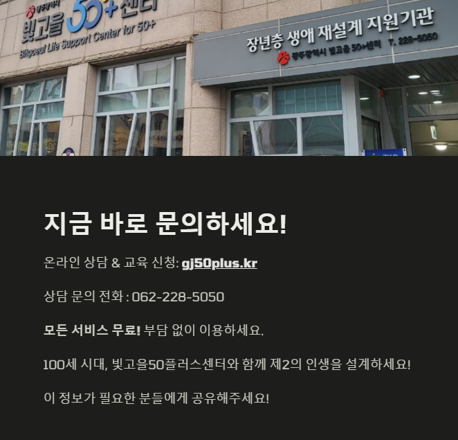 퇴직은 끝이 아닌 또 다른 시작입니다. 우리 삶은 아직 반 이상 남아있고, 그 시간을 어떻게 채우느냐에 따라 인생은 전혀 다른 방향으로 흘러가죠. 빛고을50플러스센터는 50+세대에게 꼭 필요한 나침반이자 든든한 길잡이입니다. 교육, 상담, 일, 커뮤니티까지... 당신의 두 번째 인생을 더 풍요롭게 만드는 방법, 지금 바로 시작해보세요. 고민하는 순간도 소중하지만, 행동하는 오늘이 더 큰 변화를 가져옵니다. 다음은 당신 차례예요. 😊